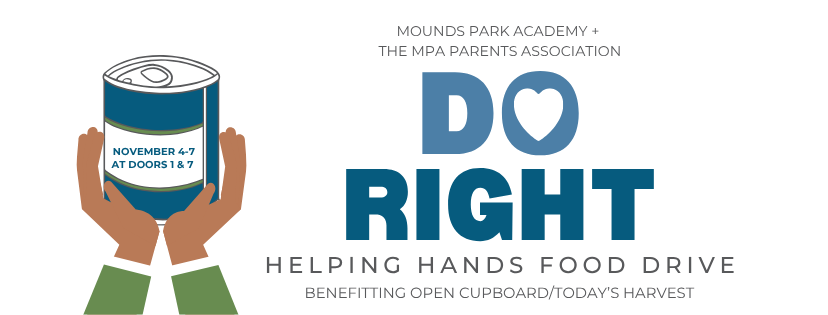 In response to the impending pause on S.N.A.P. benefits, Mounds Park Academy and the Parents Association will be hosting the MPA Do Right Helping Hands Food Drive. We have reached out to Open Cupboard/Today’s Harvest, a local food bank/free market with locations in Maplewood and Oakdale, to see how we at MPA could be of service. Open Cupboard asked if we could assist with collecting donations for their new Go Bag project. Go Bags are pre-packaged grocery bags that will help them quickly serve their 6,500+ families in times of high demand. Here's how you can help ...