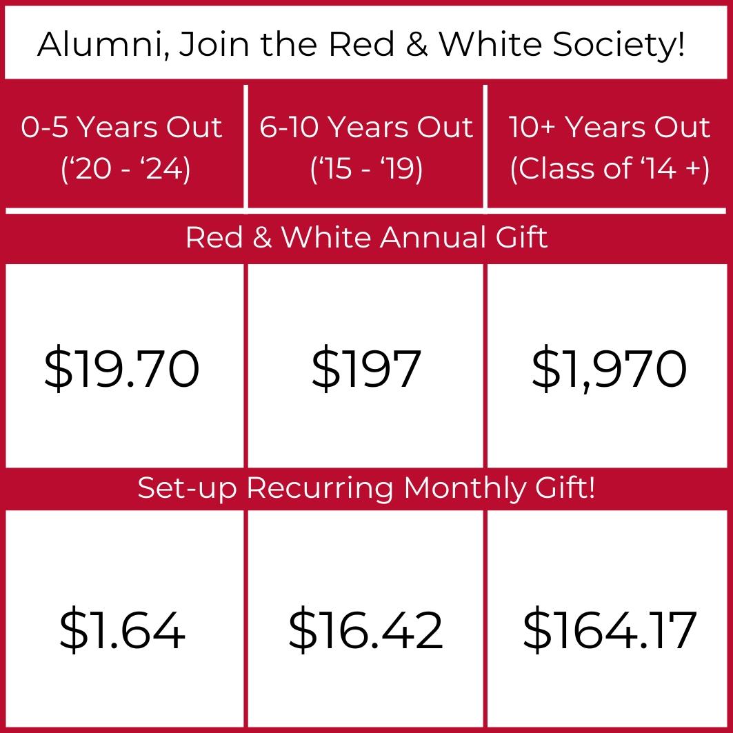This year, we are excited to launch the Red & White Society, to celebrate donors with annual contributions of $1970+ with additional levels for our young alums 0-5 years out ($19.70) and 5-10 years out ($197) from graduation. A smaller recurring monthly gift is a great way to support MPH and reach these giving levels. Recurring gifts can be easily set up on our giving page.