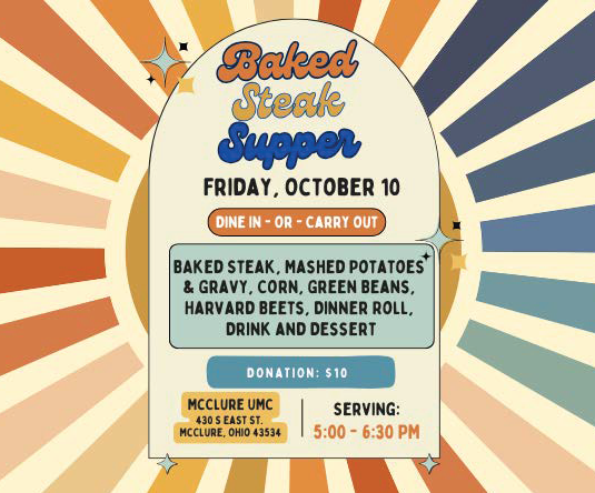 The McClure United Methodist Baked Steak Supper season continues on Friday, October 10, serving from 5:00- 6:30. The menu is Baked Steak, Mashed Potatoes & Gravy, Harvard Beets, Green Beans, Corn, Dinner Rolls, Dessert & Drink, for a donation of $10 or more. Carry outs will be available. The church is located at 430 South East Street in McClure. The phone number is 419-748-8505. Follow this event at https://www.facebook.com/McClureumchurch.
