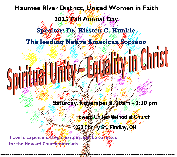 The Maumee River District United Women of Faith will be meeting on Saturday, November 8th for their Fall Annual Day. They would love for you to join them at Howard United Methodist Church, 220 Cherry St, Findlay, Ohio. They are collecting travel size personal hygiene items for the Howard Church Outreach. Registration ends November 3rd.