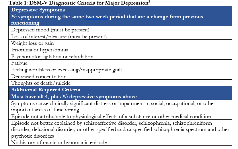 Major depressive disorder (MDD) is a serious mood disorder characterized by loss of interest in activities that previously provided enjoyment and persistently low or depressed mood.1-3 Sleep, appetite and ability to think clearly may also be affected.3 It is one of the most common mental disorders in the United States, affecting about 21 million adults in the United States in 2021.4 The World Health Organization ranked MDD as the third highest cause of disease burden in 2008 and predicts a move to the first highest cause of disease burden by 2030.2
