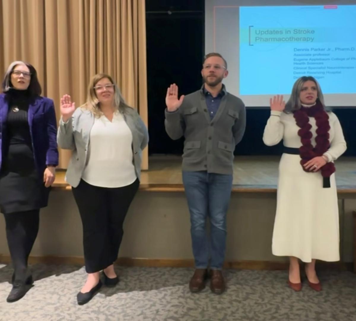 | From left, Kim Moon, Pharm.D., Jennifer Priziola, Pharm.D., BCPS, MBA, Jeff Hurren, Pharm.D. and Lama Hsaiky, Pharm.D., BCPS, were installed as the society’s newly elected executive board members during the annual awards banquet on Nov. 13, 2024. | | |