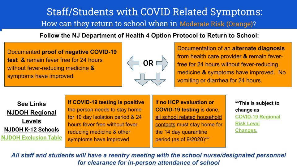 When school districts are in a region with a “High” COVID-19 activity level, such as ours, the NJDOH requires more stringent quarantine protocols. Due to our designation of “High” activity level, the district will need to exclude individuals who are determined to be close contacts of another person who has reported COVID-19 compatible symptoms. Prior to this week’s change in activity level designation, the district was notifying individuals of their need to quarantine once a person deemed to be a close contact tested positive for COVID-19.