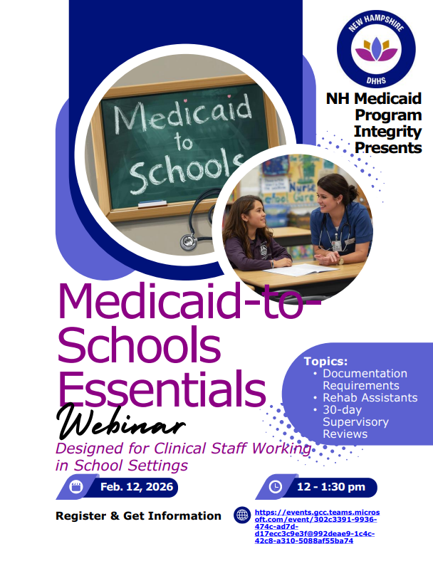 The New Hampshire DHHS Medicaid Program Integrity Unit invites professional clinical staff (occupational, physical, speech/language therapists, nurses, audiologists, applied behavior analysts, rehabilitative assistants, etc.) working in school settings to our Lunch & Learn Webinar designed to strengthen understanding of documentation requirements.