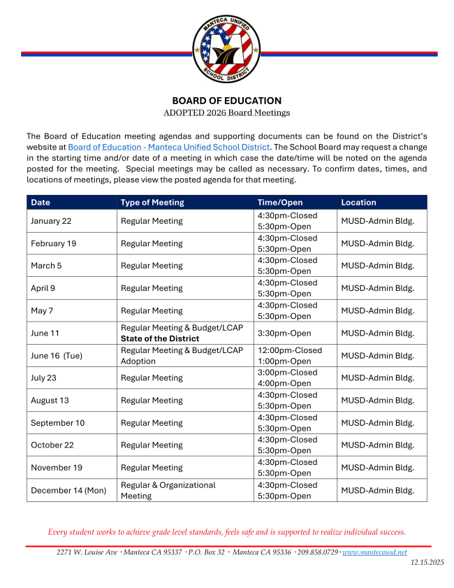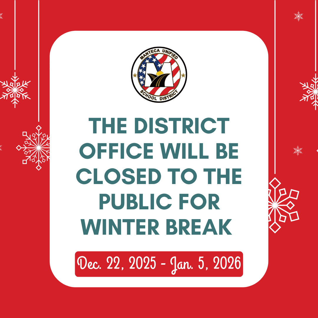 Thank you for your continued trust in Manteca Unified and for the many ways you strengthen our school community. As we enter 2026, the District remains dedicated to honoring the role our families play in their child's educational journey, supporting both academic growth and overall well-being.