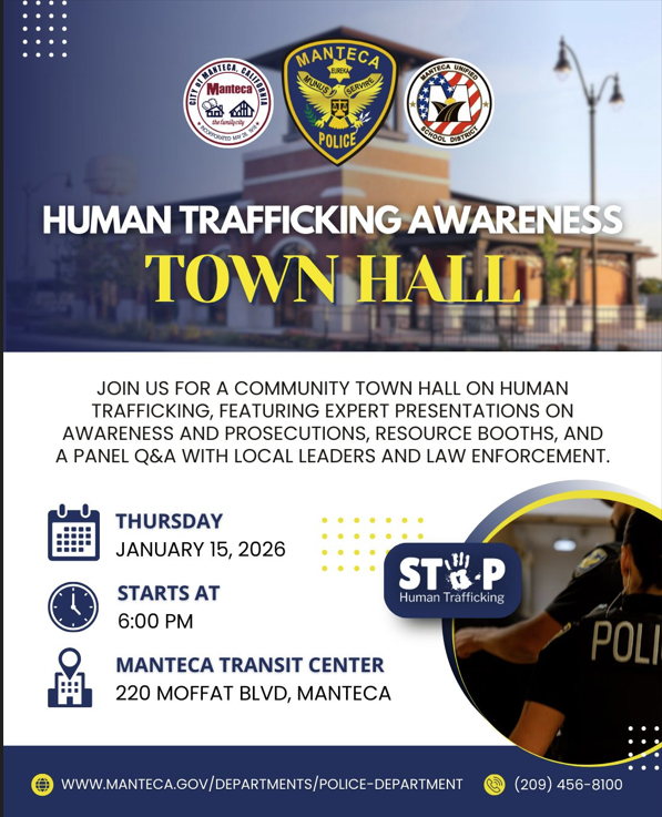 Manteca Unified is partnering with the City of Manteca and the Manteca Police Department to host a community town hall on human trafficking.