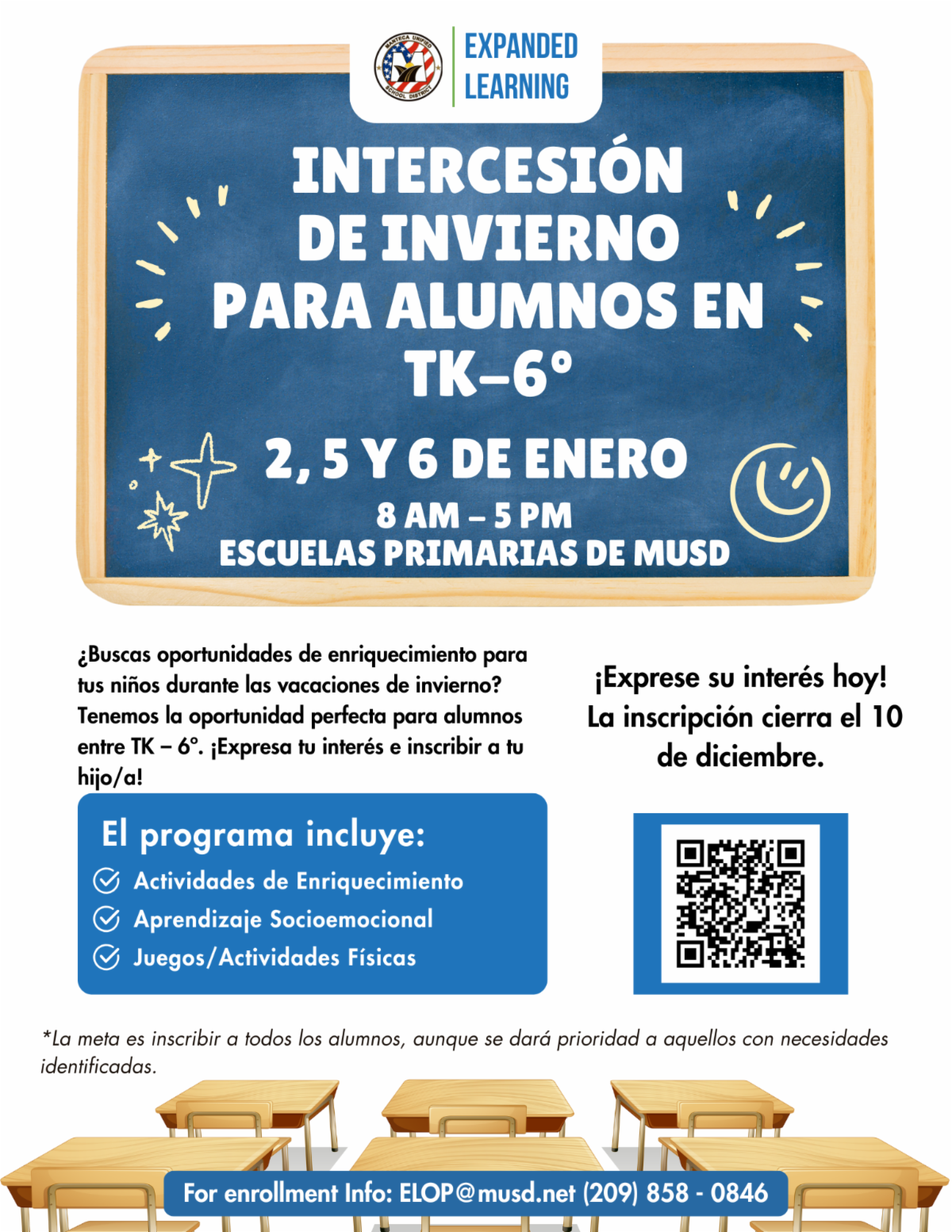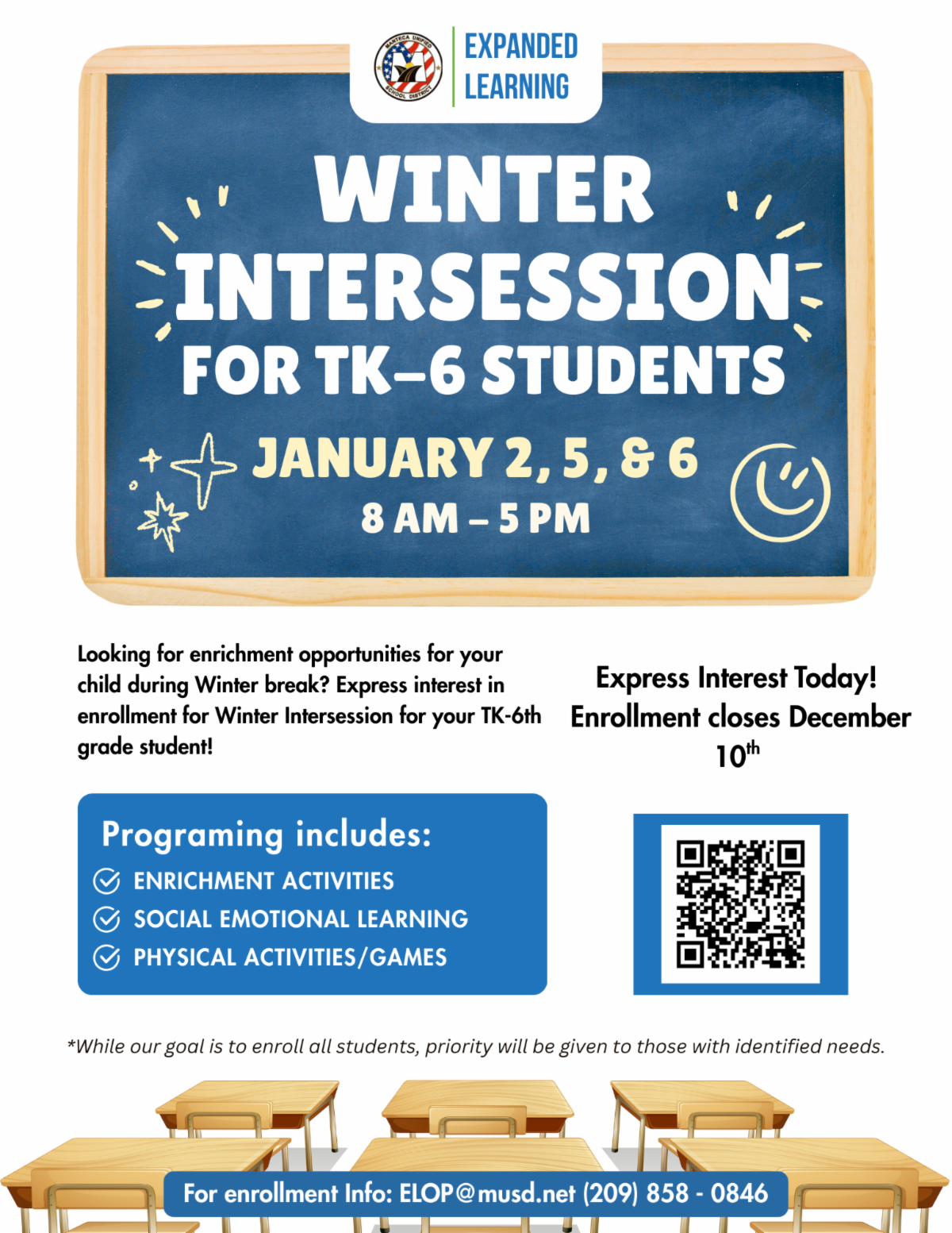 | | Expanded Learning Programming During Winter Break | | Looking for enrichment opportunities for your child during Winter break? Express interest in enrollment for Winter Intersession for your TK-6th grade student! | | |