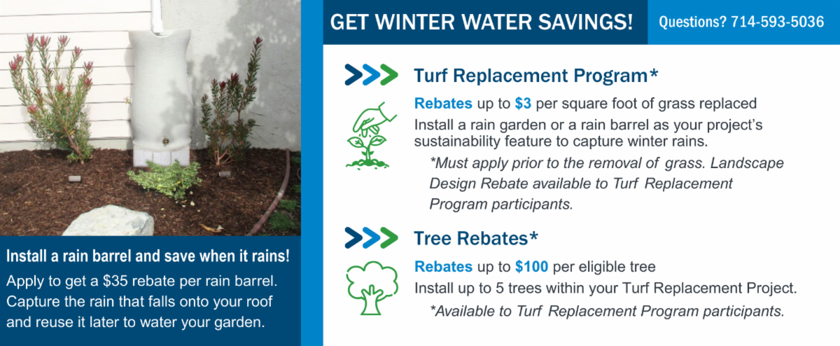Did you know? MWDOC offers rebates to help residents install rain barrels and cisterns that collect roof water runoff for use in gardens and landscapes. This easy, sustainable practice supports water-use efficiency, reduces stormwater pollution, and promotes healthier plants by providing naturally untreated water. Learn how rain barrels can help you conserve water and support a more resilient community.