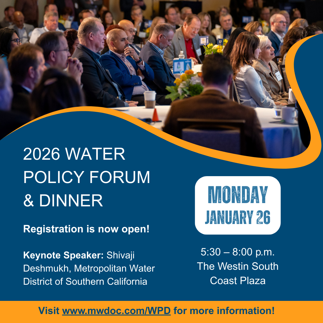 Welcome to the MWDOC’s eCurrents newsletter, where we’re sharing upcoming events, water-saving tips, and community programs across Orange County. In this issue, you’ll find how to register for the upcoming Water Policy Forum & Dinner, ways to save water during the holidays, and details to enter the Water Awareness Poster Contest.