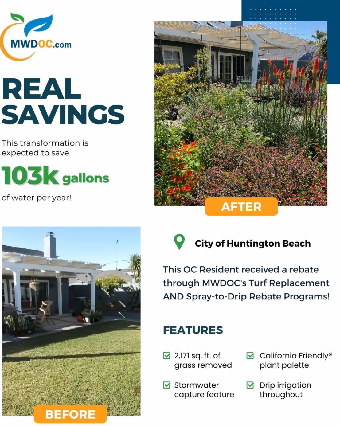 Efficiently beautiful! One Huntington Beach resident transformed 2,171 sq. ft. of grass into a stunning water-saving garden through MWDOC’s Turf Replacement Rebate Program. With drip irrigation and rock garden additions, this project is expected to save 103k gallons of water annually.