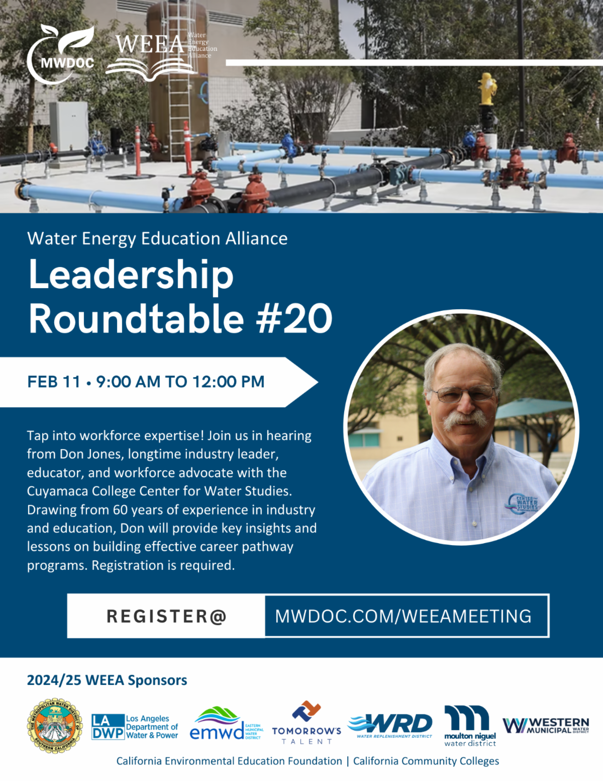 Unlock the future of our water and energy workforce! Mark your calendar for February 11, 2025, and join us for the next Water Energy Education Alliance (WEEA) meeting. Don’t miss this unique opportunity to learn from Don Jones of Cuyamaca College’s Center for Water Studies—a celebrated industry leader and workforce development expert with 60 years of experience as a skilled tradesperson, trainer, safety officer, organizational development manager, educator, and workforce advocate. Don brings unmatched expertise to what is sure to be an inspirational, informed discussion.