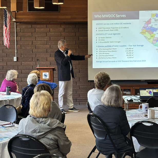 Engaging with our community is where meaningful conversations begin. MWDOC/Metropolitan Director Karl Seckel recently spoke to the Woman’s Club of Seal Beach, sharing insights on water reliability, sustainability, and the cutting-edge initiatives shaping Orange County's water future. Through MWDOC’s Speakers Bureau, our water experts interact with community groups to discuss the vital work of Orange County water providers to ensure a sustainable water supply for generations to come.