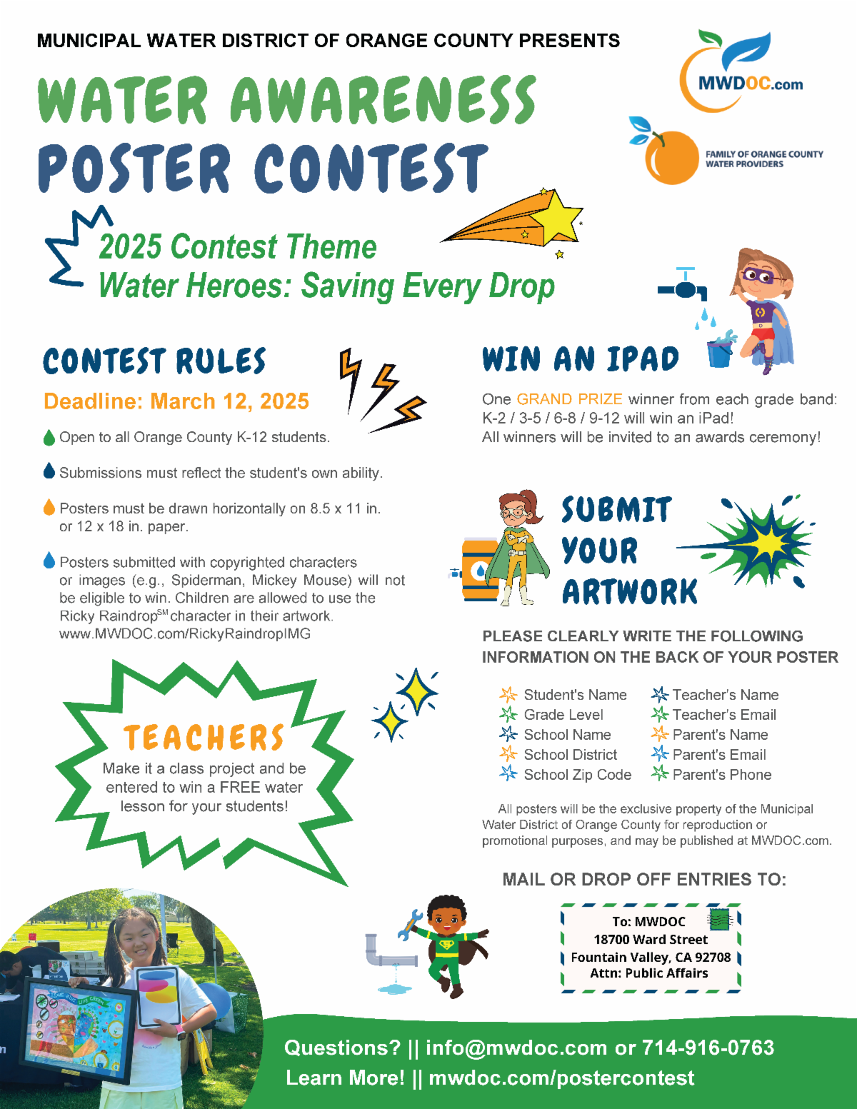 Did you know? The annual Water Awareness Poster Contest is now open! This year’s theme, “Water Heroes: Saving Every Drop,” invites you to share what water means to you through your creative artwork. Submit your original piece to by March 12 for a chance to win exciting prizes, including an iPad! || Learn more: www.mwdoc.com/postercontest