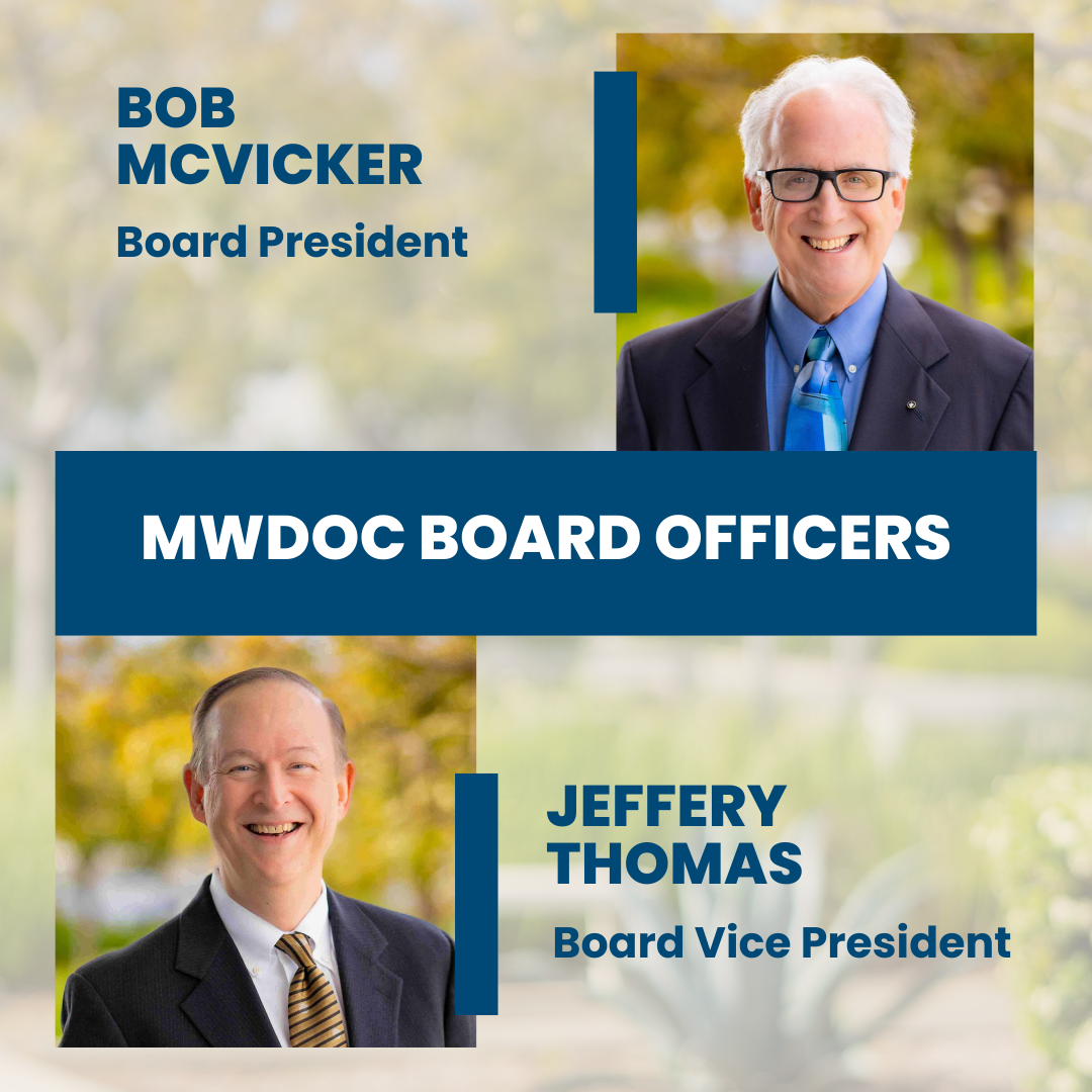 MWDOC has reappointed Director Robert (Bob) McVicker as President of its Board of Directors, with Director Jeffery M. Thomas serving as Vice President. McVicker, who previously served as Vice President, has been on the Board since 2019 and was elected in 2020. He represents Division 3, covering several Orange County communities. With over 40 years of experience in the water industry, he has contributed significantly to professional organizations and has held various public service roles. Vice President Thomas, an investment management professional, has been on the MWDOC Board since 2009 and represents Division 6. His background includes serving as Mayor and Councilman of Tustin, and he holds a law degree from Western State University.
