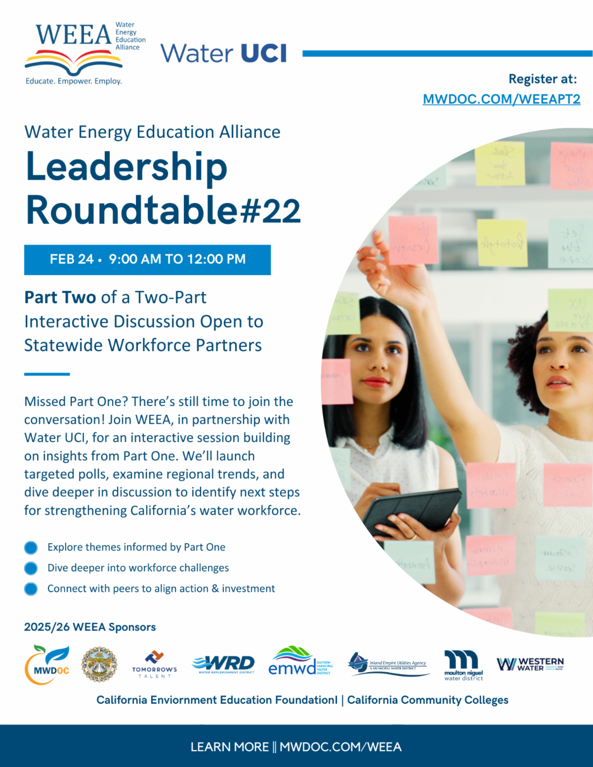 It’s time to turn insight into action. Part Two of the Water Energy Education Alliance (WEEA) Leadership Roundtable #22 builds on the momentum of Part One by bringing regional industry and education professionals back together to dive deeper into shared water workforce challenges, successes, and opportunities. Hosted in partnership with the Water UCI student-centered research team, this interactive session will focus on collaboration, shared investment, and practical next steps to strengthen California’s water workforce.