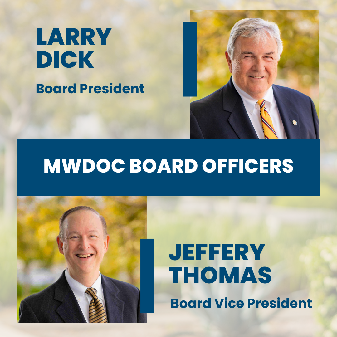 MWDOC’s Board of Directors has selected new leadership for the year ahead. The Board appointed Larry D. Dick as President and re-elected Jeff Thomas as Vice President to help guide the District’s work on water reliability, efficiency, and regional partnerships.