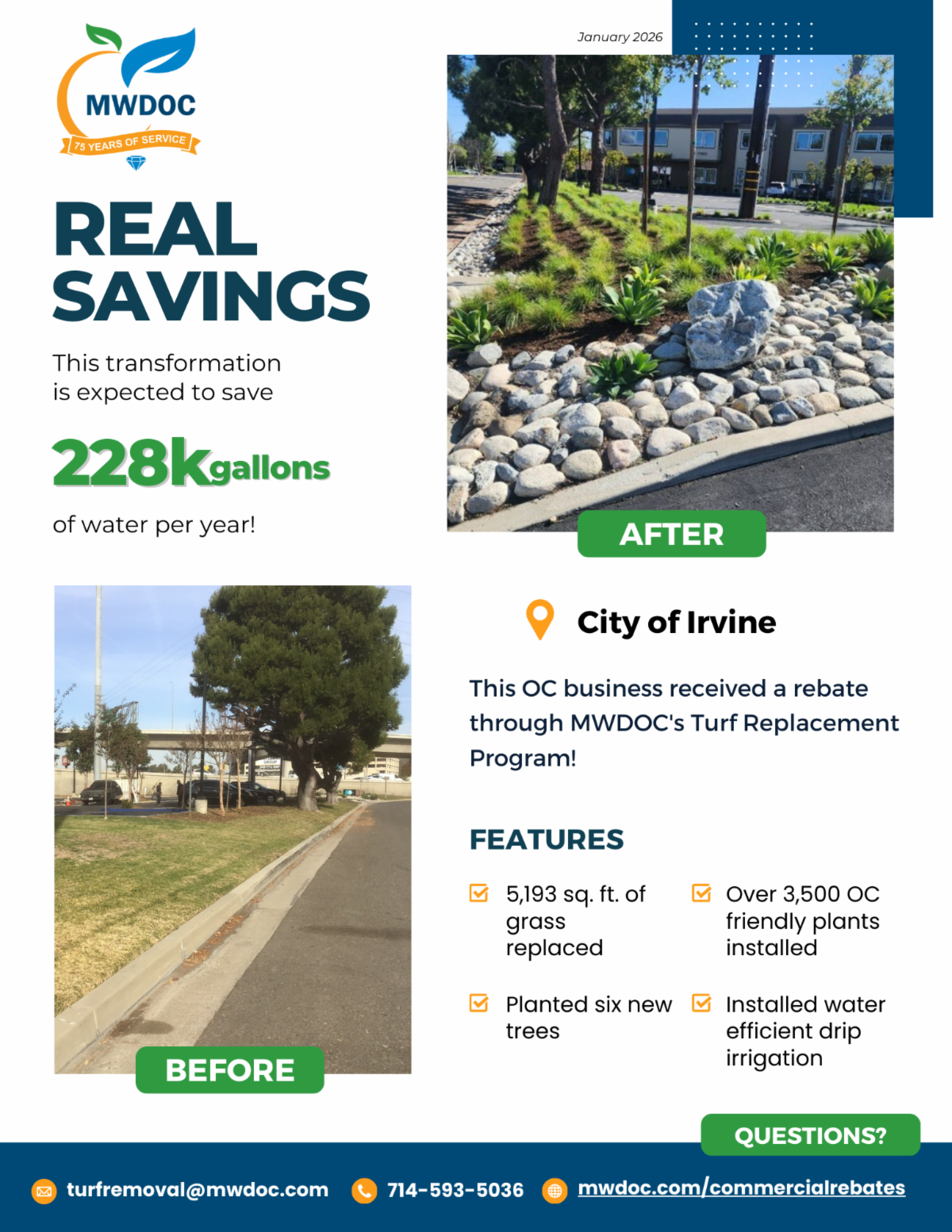 MWDOC staff continue to receive thanks from businesses, city staff, and residents who go through the process to receive water-saving rebates! If you’re interested in learning how to save money while you transform your landscape, connect with our team. Email turfremoval@mwdoc.com.