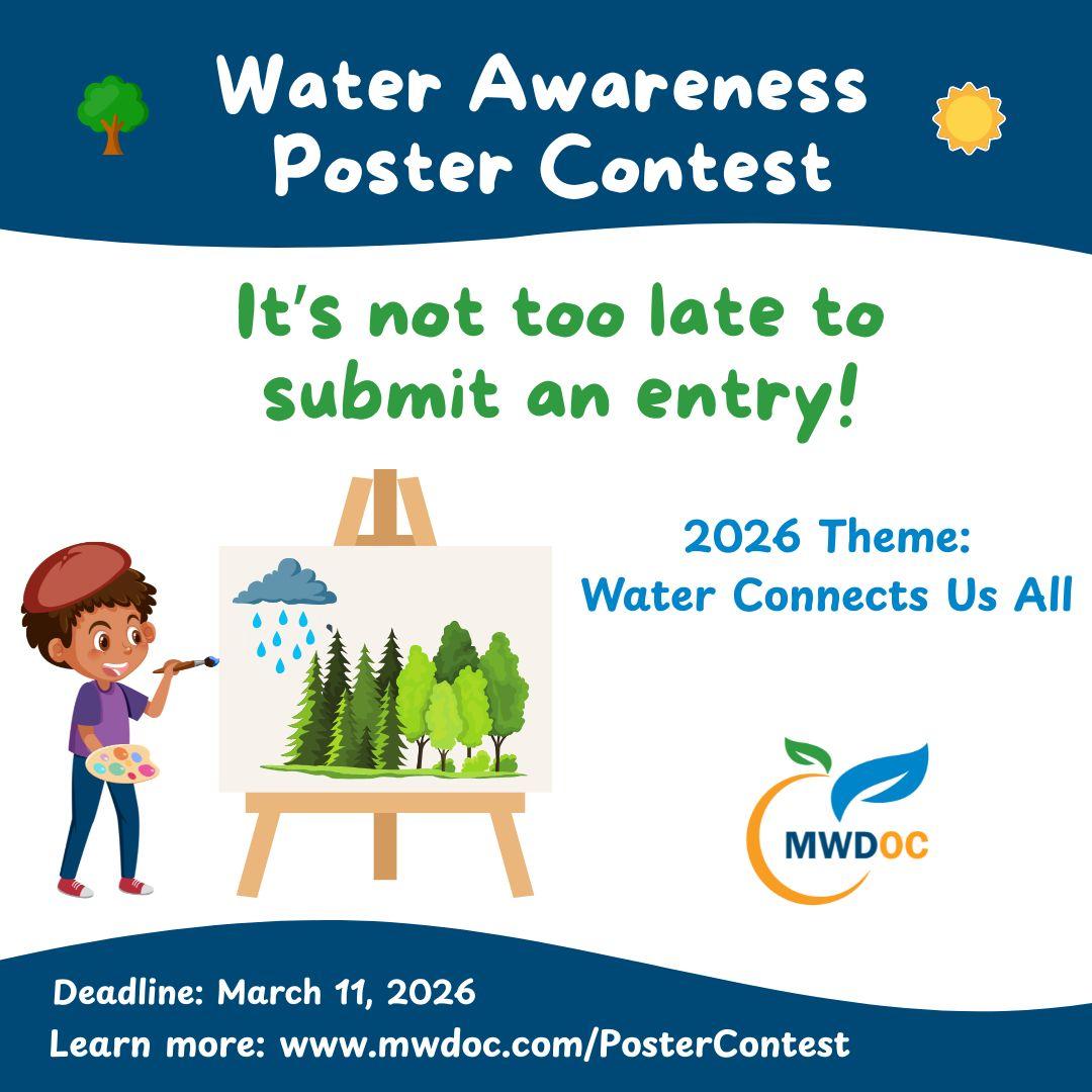MWDOC’s Annual Poster Contest is open to all Orange County K–12 students, with just one month left to submit entries before the March 11 deadline. This year’s theme, “Water Connects Us All,” invites students to explore the vital role water plays in our daily lives and communities. By participating, students join a long-standing tradition that encourages creativity, learning, and responsible water stewardship.