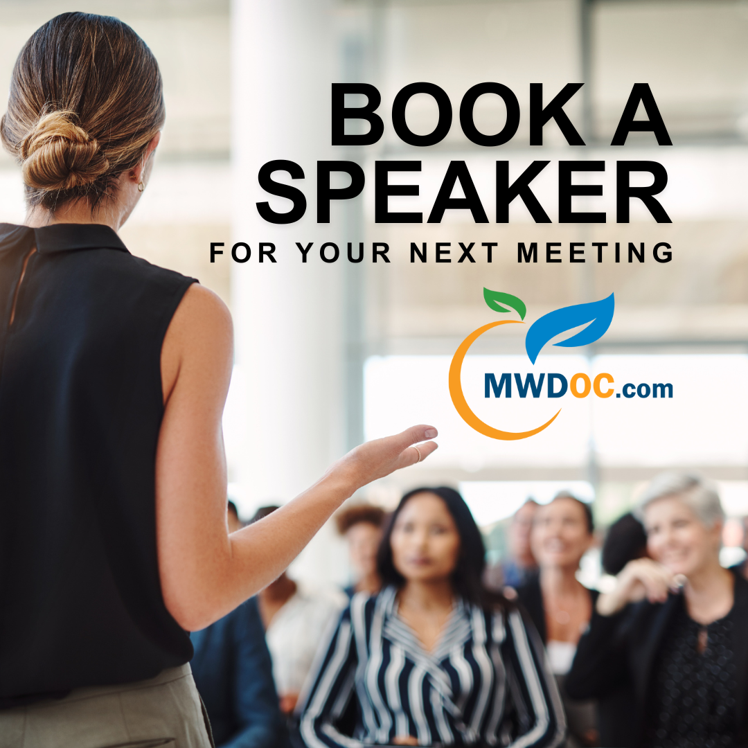Interested in MWDOC programs and water issues affecting our area? Learn about changes coming to your neighborhoods with AB1572 implementation. Spread the word, book a MWDOC speaker for your next event or meeting.