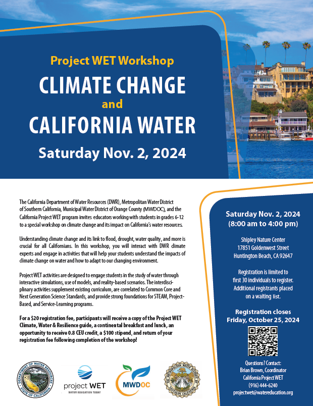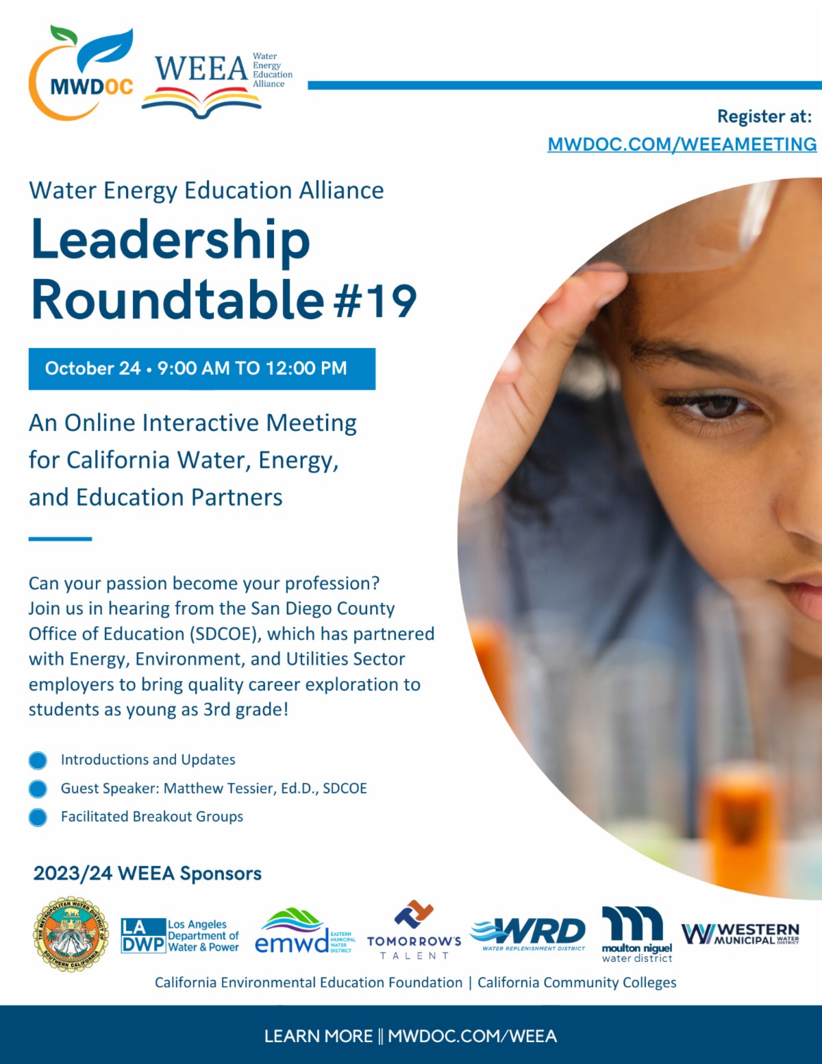 Did you know? While 30-50% of the current water workforce will retire in the next 10 years, less than 10% of today's high school students express interest in water careers. The Water Energy Education Alliance (WEEA), administered and led by MWDOC, invites you to join us for our next Leadership Roundtable meeting on Thursday, October 24, 2024, from 9:00 AM to 12:00 PM, where we will welcome Dr. Matthew Tessier with the San Diego County Office of Education’s (SDCOE) Linda Vista Innovation Center as our featured guest speaker. Hear from Dr. Tessier about SDCOE's partnerships with Southern California water agencies to bring quality career exploration to students as young as 3rd grade. Registration is required to attend.