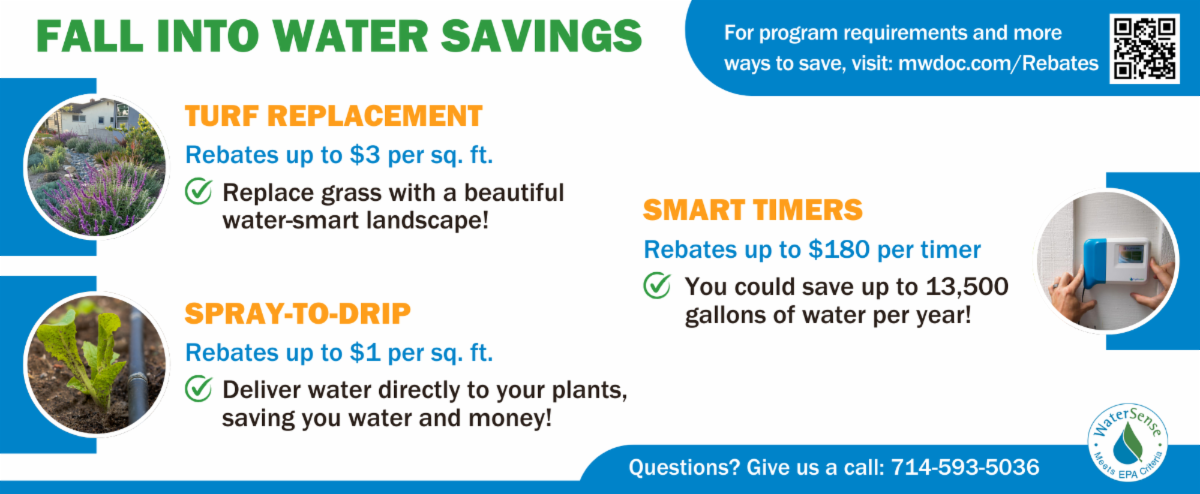 As we head into the fall season, grab a warm drink and cozy up with your favorite blanket as you explore this latest edition of the Municipal Water District of Orange County’s (MWDOC) eCurrents newsletter. Fall is the perfect time to refresh your garden, and we’ve got you covered with water-smart gardening tips and resources to help you make the most of the season, saving water, time, and money all year long.