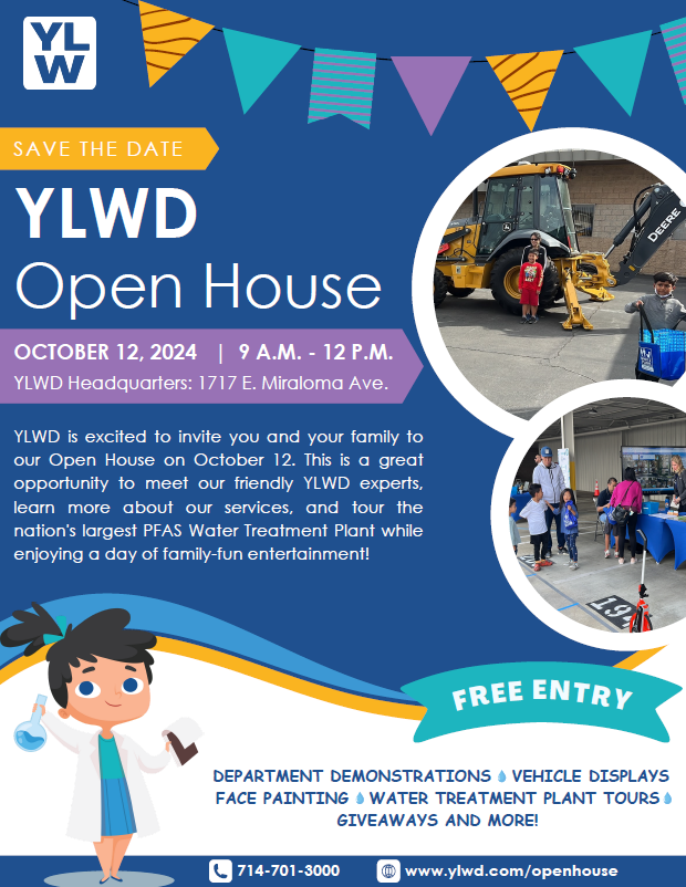 Save the date and join us at Yorba Linda Water District’s Open House on Saturday, October 12. Ricky the Rambunctious Raindrop℠ will be stopping by for his first public appearance since he unveiled his new look! Stop by for FREE demonstrations, vehicle displays, a tour of the nation’s largest PFAS Water Treatment Plant, and more. Let’s enjoy a day of family-friendly, water-smart fun together!