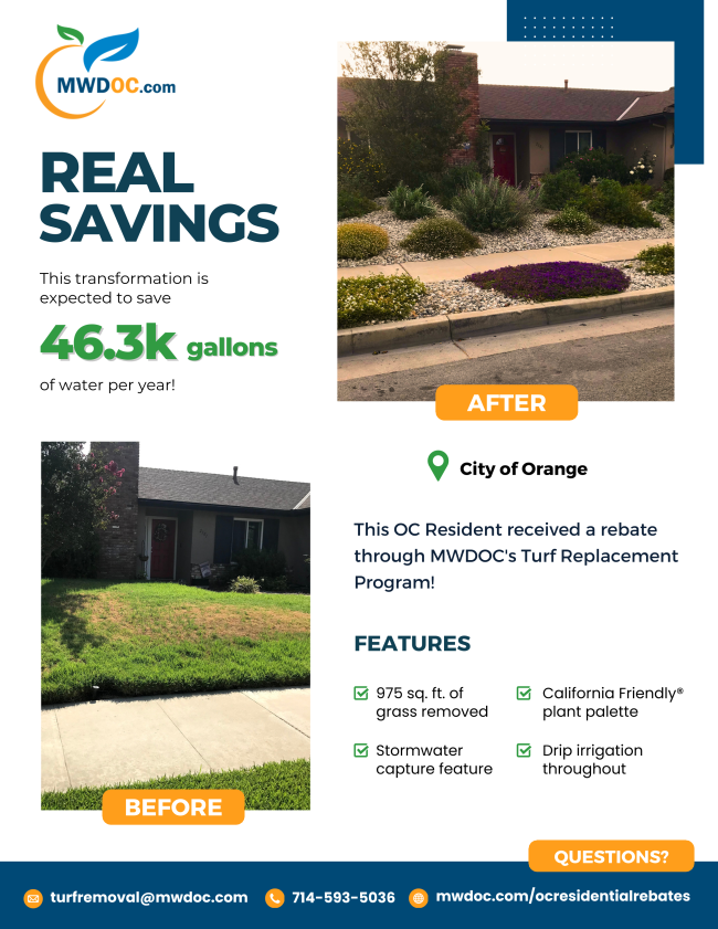 Hey OC! Did you know? By replacing thirsty grass with a beautiful, California-Friendly plant palette, you can reduce your water usage by 50-70 percent. A recent participant in our Turf Replacement Program is saving BIG with an estimated 46,300 gallons of water saved per year! Discover more sustainable tips and resources for your next garden project.