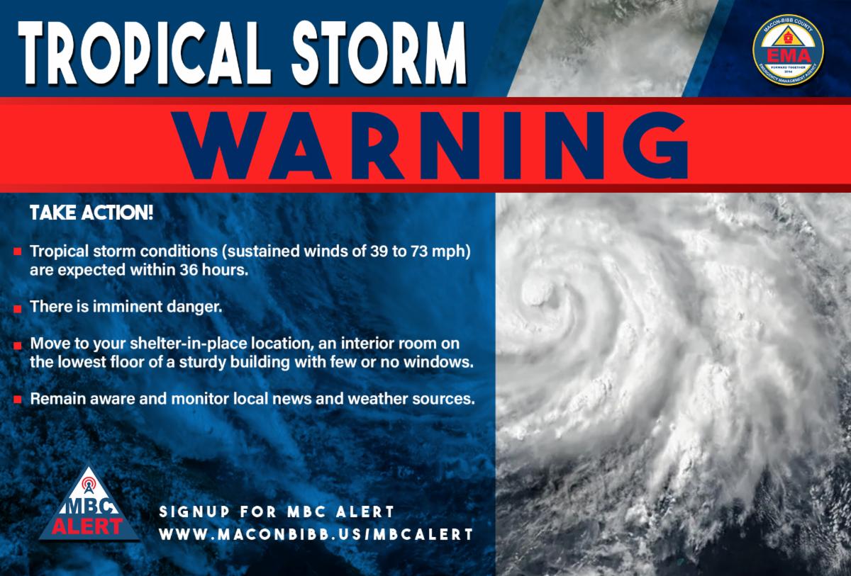 Macon-Bibb County is still under a Tropical Storm Warning. To report downed trees and other damage, call 833-535-4362 or use the MBCAlert Mobile app.