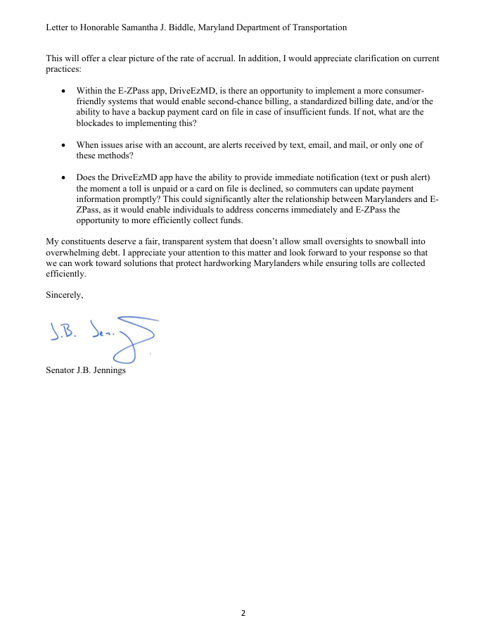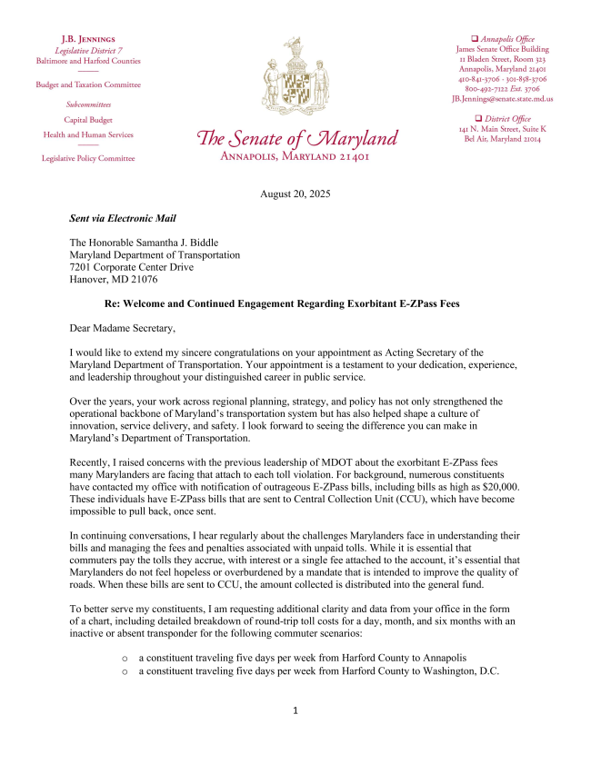 Below is an updated letter I wrote to the Maryland Department of Transportation's new Secretary with ongoing concerns regarding EZ-Pass: