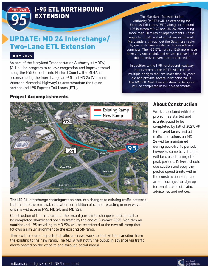 The Maryland Transportation Authority (MDTA) is making major progress on the I-95 Express Toll Lanes (ETL) Northbound Extension/MD 24 Interchange Reconstruction Project. To prepare for the realignment of northbound MD 24 onto the new bridge structure, crews will complete significant construction the weekend of September 5–8, 2025.