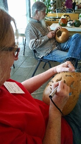 When Donnie and Donna Smith planted gourds by their back porch, their journey as craftspeople began. First, a design is drawn on the gourd with pencil and then the design is burnt into the gourd surface with a wood burning tool. They then paint the designs with watercolors, inks, dyes and water-based stains, and seal each gourd with a clear acrylic.