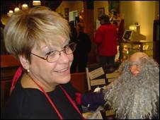 Evans creates one-of-a-kind and limited edition Santa's and dolls developed from studies of real people. She sculpts the faces from polymer clay, paints the features, and uses vintage fabrics to sew the clothing she designs.