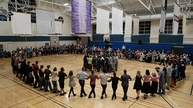 Our contra dances are fun for the whole family. No partner or experience is needed. All dances are taught first and then prompted. We change partners after every dance and are especially welcoming to new dancers! Wear loose, comfortable clothing and flat smooth-soled shoes that won't mar the fine wood floor, then get ready for a good workout!