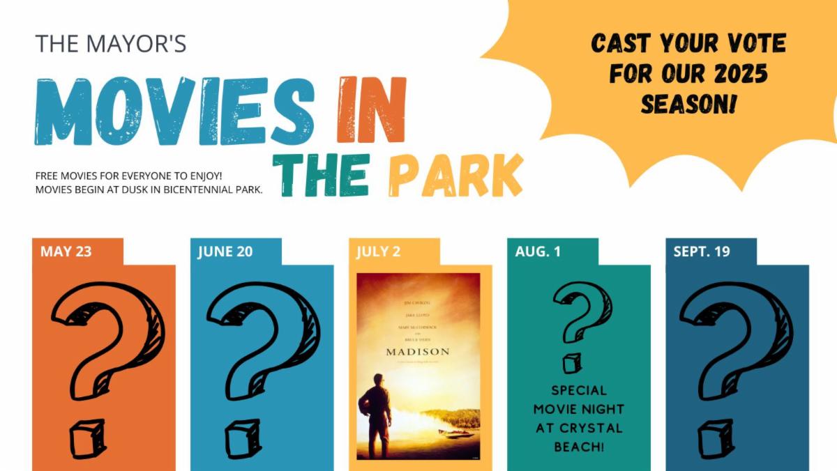 We need your help choosing the movies that will take center stage at Bicentennial Park this year. While our July movie will be "Madison", you'll still vote for the movies in May, June, August, and September. We’re also excited to announce that our August movie will be shown at Crystal Beach! Stay tuned for more details.