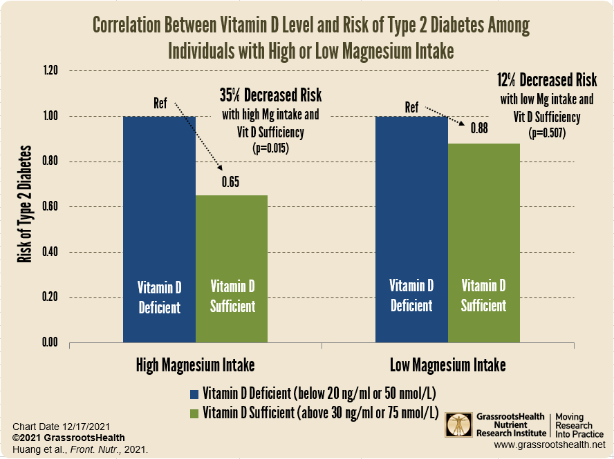 In the group with high magnesium intake, there was a 35% significantly decreased risk of type 2 diabetes among the participants with vitamin D sufficiency compared to those with vitamin D deficiency, compared to the group with low magnesium intake, which only had a 12% decreased risk among those with vitamin D sufficiency, and the finding was not significant.