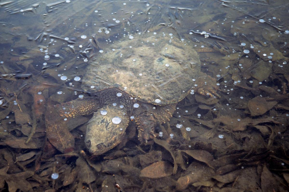 Options for Oxygen For Maine’s aquatic turtles (Blanding’s, musk, painted, snapping, spotted, and wood turtles), brumating underwater where they are sheltered by undercut banks, hummocks, roots, and mud, is a good solution for maintaining temperature. But living beneath a frozen surface creates a new challenge- acquiring oxygen. In the warmer months, turtles can spend relatively lengthy periods underwater and rise to the surface to breathe as needed. Once water freezes over in winter they don’t have this option, so how do they obtain oxygen?