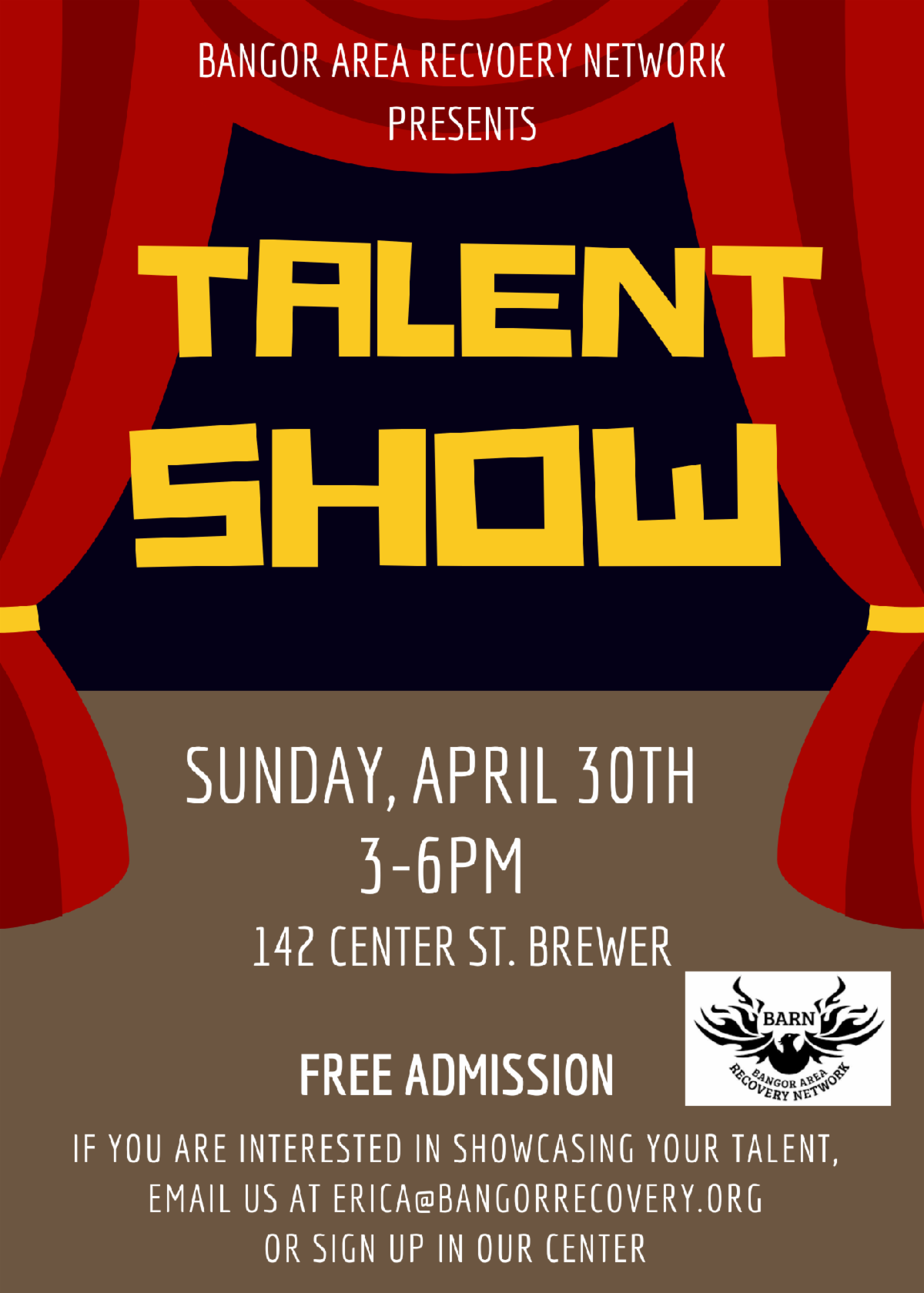 Got a hidden talent? BARN is hosting a Talent Show from 3 to 6 p.m. April 30 at 142 Center St. in Brewer. Admission is free. If you’re interested in showcasing your talent, send an email to erica@bangorrecovery.org.