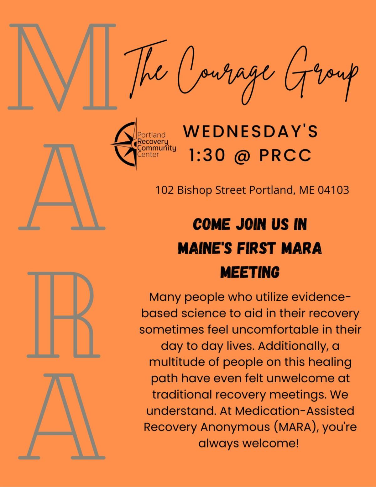 The Courage Group MARA (Medication-Assisted Recovery Anonymous) is held from 1:30 to 2:30 p.m. on Wednesdays.