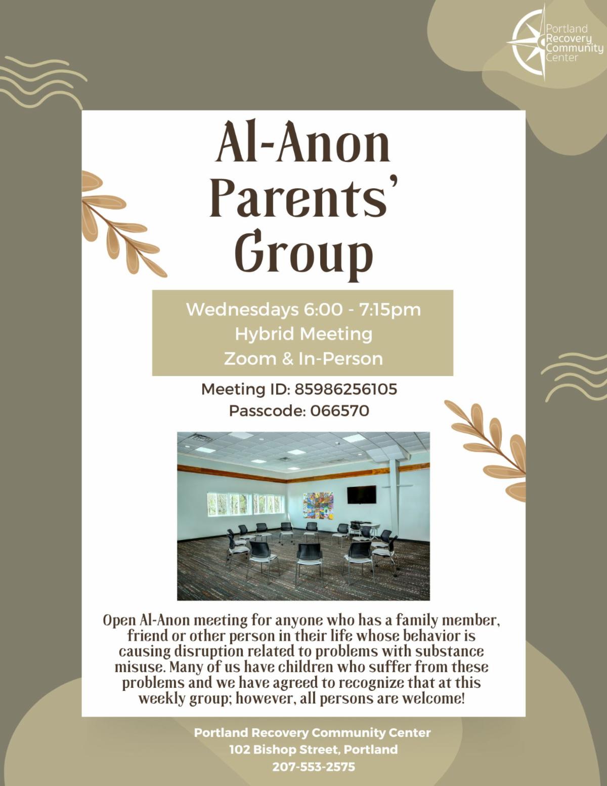 Al Anon Parents’ Group will meet from 6 to 7:15 p.m. on Wednesdays at PRCC, 102 Bishop St. in Portland.