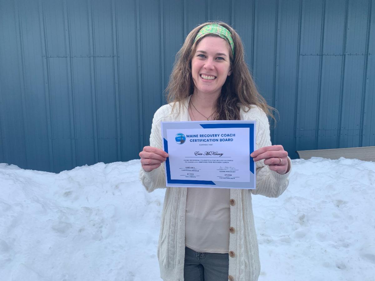 Erin McKinney was awarded Maine's first recovery coach certificate, validating 500 hours of coaching.