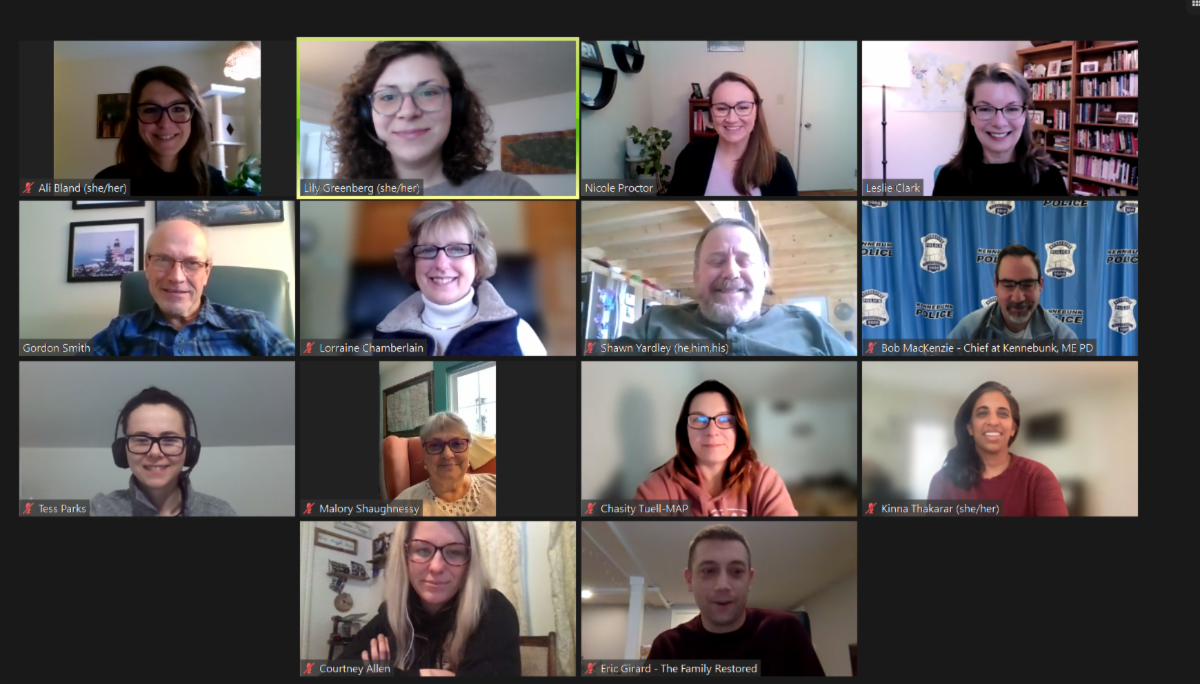 Members include Gordon Smith (Director of Opioid Response in Maine), Courtney Allen (Director of Maine Recovery Advocacy Project - ME-RAP), Lorraine Chamberlain (Program Director of AMHC), Bob Mackenzie (Chief of Kennebunk Police Department), Shawn Yardley (CEO of Community Concepts), Kinna Thakarar (Addiction Specialist at MaineHealth), Malory Shaughnessy (Executive Director of Maine Alliance for Addiction & Mental Health Services), Chasity Tuell (Program Director of Maine Access Points), and Eric Girard (Co-founder and President of the Family Restored).