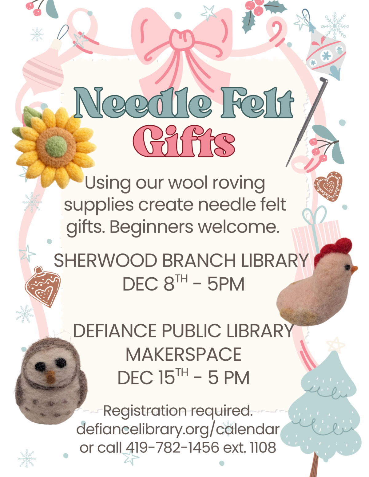 Also this month is our Needlefelt gifts class, where you can use our needlefelt supplies to make gifts for your friends and family. Registration is required for these two classes at Defiance and Sherwood.