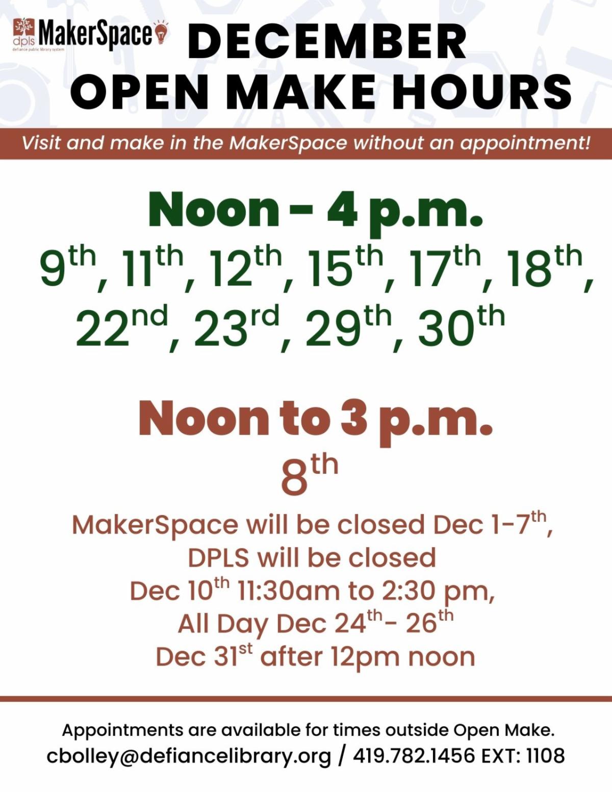 Please note the MakerSpace will be closed the first week of December. The entire library will also be closed due to the holidays December 10 (11:30 -2:30), December 24-26th (All day), December 31st (at 12pm noon). Check the open make times or make an appointment if you would like to use the MakerSpace.