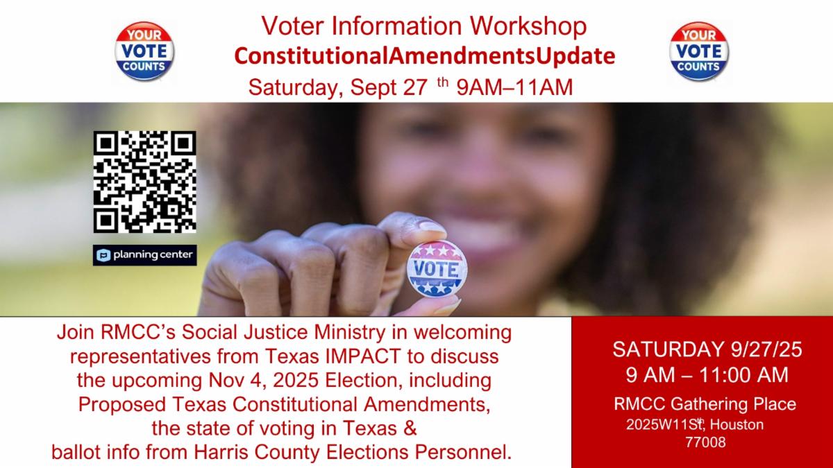 Join Resurrection’s Social Justice Ministry & Harris County Clerk's Election Office for an election education event to provide information relating to the Nov 4th 2025 Uniform Election. The presentation will provide information detailing what's on the ballot, discuss the importance of making a plan to vote, ways to ensure your mail in ballot is counted, teach participants how to operate the voting equipment and much more.