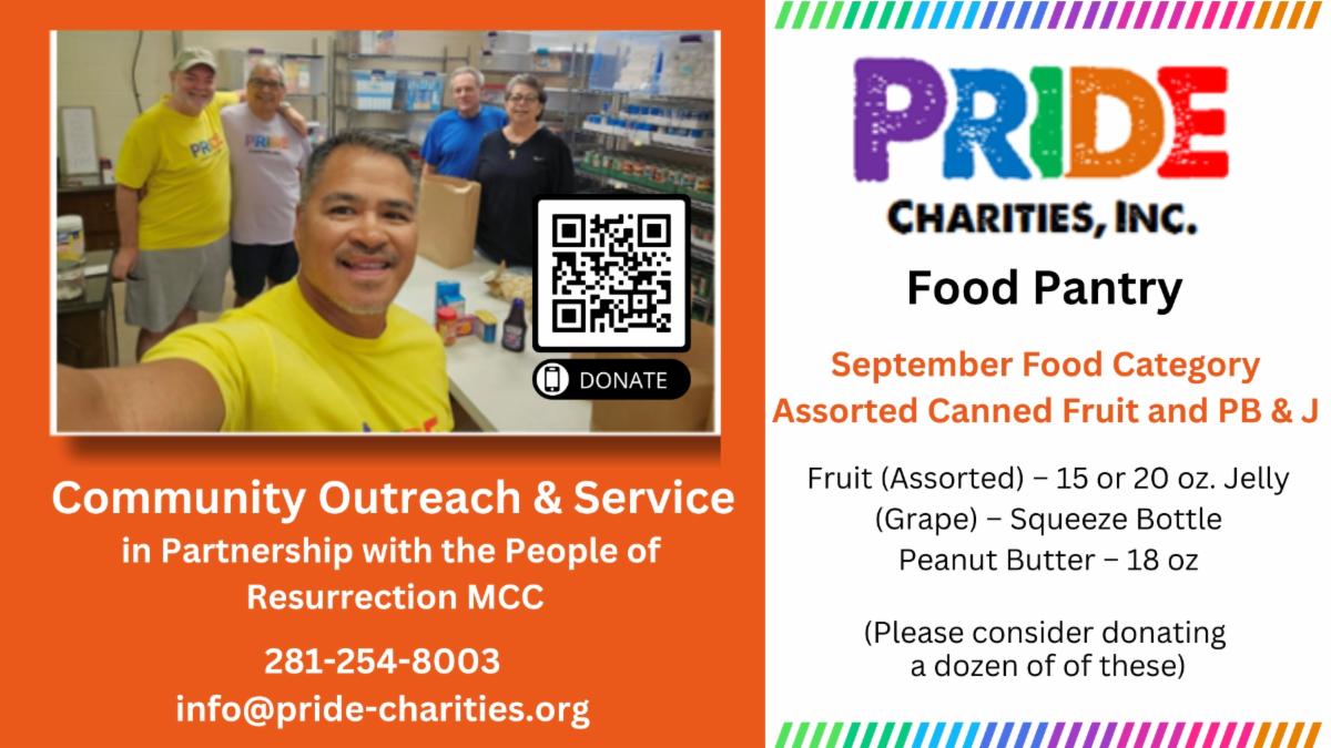 | | Amazing things happen when we pray for one another in times of grief and celebrate together in times of joy. Send Requests online here: COMPLETE ONLINE FORM or by texting the word RMCCPRAY to 97000. We hope this electronic method will make it quick and easy to communicate the struggles and triumphs you are experiencing in a way that can provide our Pastoral Care Ministers with the information they need to support and encourage you along your journey. The form allows you to provide your name, contact information, the information about your prayer request or celebration, as well as an easy way to request a contact from a Pastoral Care Minister (only if you indicate you'd like a contact). Based on your preferences we can communicate by text, phone, video chat, or even in-person visits when necessary. We want to hear from you! | | If you haven't downloaded the church app, it's important that you do! Each time you attend a service in person or virtually, please CHECK IN so we know you were here. Using the church app is easy! You can find detailed instructions here. We hope you will download it and stay connected! | | Pride Charities, our partner agency which operates the food pantry at Resurrection MCC, relies on donations and financial support for the food needed to help the 175 families we assist each month. Please consider picking up a few extra dry goods, or any of the items found on this list. We are pausing clothes donations. | | |