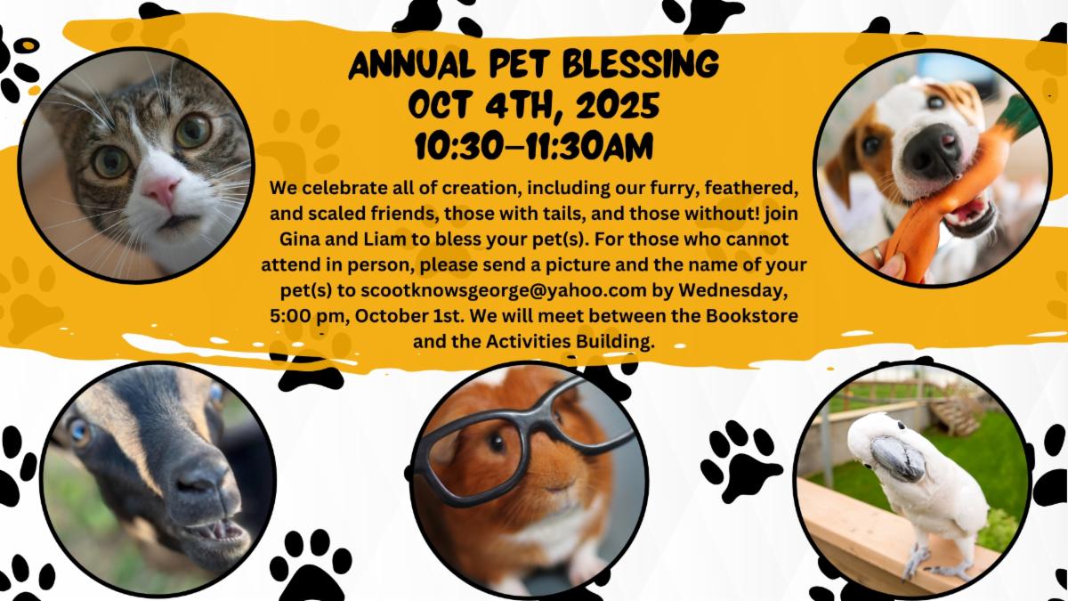 We celebrate all of creation, including our furry, feathered, and scaled friends, those with tails, and those without! In honor of St. Francis of Assisi, join Gina and Liam to bless your pet(s). For those that cannot attend IN-person, please send a picture and the name of your pet(s) to scootknowsgeorge@yahoo.com by Wednesday, 5:00 pm October 1st. We will meet between the Bookstore and the Activities Building.