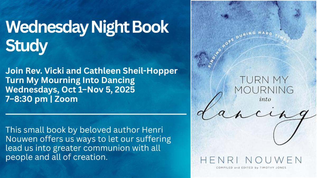Join Rev. Vicki and Cathleen Sheil-Hopper for a discussion of Turn My Mourning Into Dancing. This small book by beloved author Henri Nouwen offers us ways to let our suffering lead us into greater communion with all people and all of creation. Six Wednesday evenings, October 1 through November 5, 2025, 7-8:30 pm on Zoom.