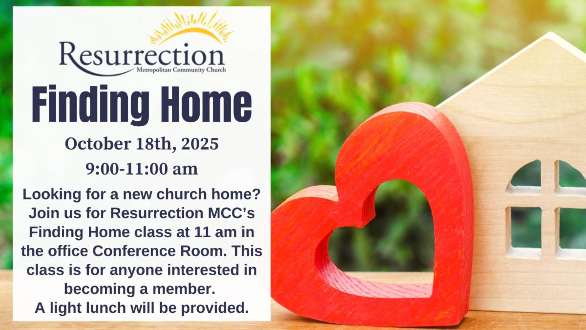 Want to learn about finding a new church home? Do you have a desire to be engaged with a faith-based community? If so, then meet us at 9:00 am in the Gathering Place for Resurrection MCC's Finding Home class. This class is specifically for all people who would like to become a member of Resurrection MCC and make our church their new church home. A light breakfast will be provided.