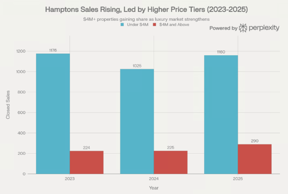 | | One of the select-few truly exclusive and distinguished boutique cooperatives on all of Park Avenue..."all limestone, with double sets of Florentine-style windows and with only one five-bedroom apartment per floor"...nearly 70 feet of frontage facing Park Avenue...extraordinary volume...10’ ceilings…innumerable, large outward facing windows...four exposures...views and streams of sun and light throughout...private elevator landing and 375 sqft entry gallery, perfect for art...SE facing living room...oversized dining room...south facing library...an unusual and seductive corridor, 7 feet wide and nearly 48 feet long, perfect for art…commodious primary bedroom suite...and what was once described as a home with “six servants’ rooms, including a separate section for the butler and the second man” is now is currently 15 rooms, inclusive of 5 bedrooms, 6 bathrooms and two staff rooms...unparalleled location, in close proximity to world class restaurants, shopping, entertainment, art and culture, including the Metropolitan Museum of Art, The Frick Collection, Lincoln Center…this list goes on...COMING SOON. | | Over the past couple of months, the Hamptons have felt like a quieter but still very expensive market; contracts activity is approximately half the weekly pace as last year at this time. That said, median and average price, especially in primary townships like Southampton, East Hampton, Bridgehampton, and Amagansett, are coming off a 2025 that saw double‑digit price growth and enormous gains in the $20M+ sector. Slowly increasing inventory has now begun to outpace contracts signed. Also the “days on market” have stretched into a more normal range, at approximately 3 months. Buyers are picky, but are willing to pay up for turnkey, well designed, “quiet luxury” product in top locations. Twenty-twenty-six 2026, will see an evolution in the same; no definitive resets are in the cards. We will likely see modest price appreciation rather than a spike. In the non-trophy segment, slightly elevated inventory should provide some room to negotiate. Although it probably goes without saying, the truly exclusive properties, which include waterfront properties, where global wealth, limited supply, and lifestyle value will keep the Hamptons firmly in the top tier of luxury destinations. | | Estimated Hamptons deal activity by price segment (under $4M vs $4M+) from 2023 through 2025 | | * WHAT REPRESENTATION LOOKS LIKE * | | |
