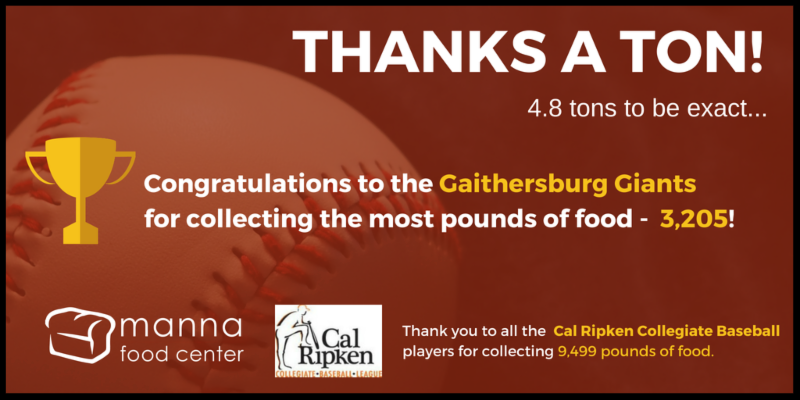 college baseball players who have come from across the country to play summer baseball in Montgomery County collected 9,499 pounds of food at twelve Giant Food stores across Montgomery County for the Manna Food Center. The Gaithersburg Giant upset the perennial champion Rockville Express to win the Ninth Annual Cal Ripken Collegiate Baseball League's Feed the Hungry Challenge by collecting an individual team record 3,205 pounds of food. Players from the Bethesda Big Train and Silver Spring-Takoma Thunderbolts also collected food on Saturday. Despite wilting heat, the league total was the highest in the nine years of the challenge as three of the four teams recorded dramatic increases over previous years. In the nine years of the competition, the college players have collected 53,171 pounds of food - nearly 27 tons of food for Montgomery County's neighbors in need.